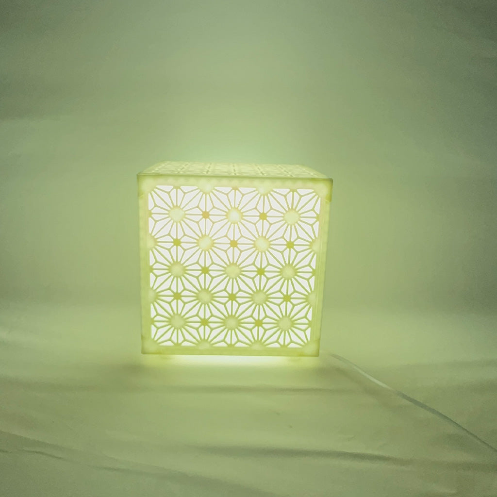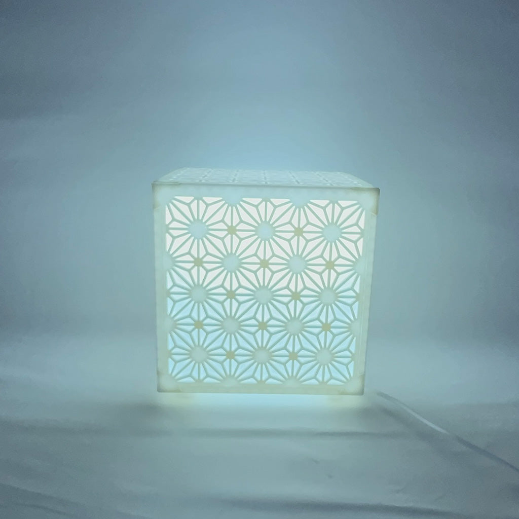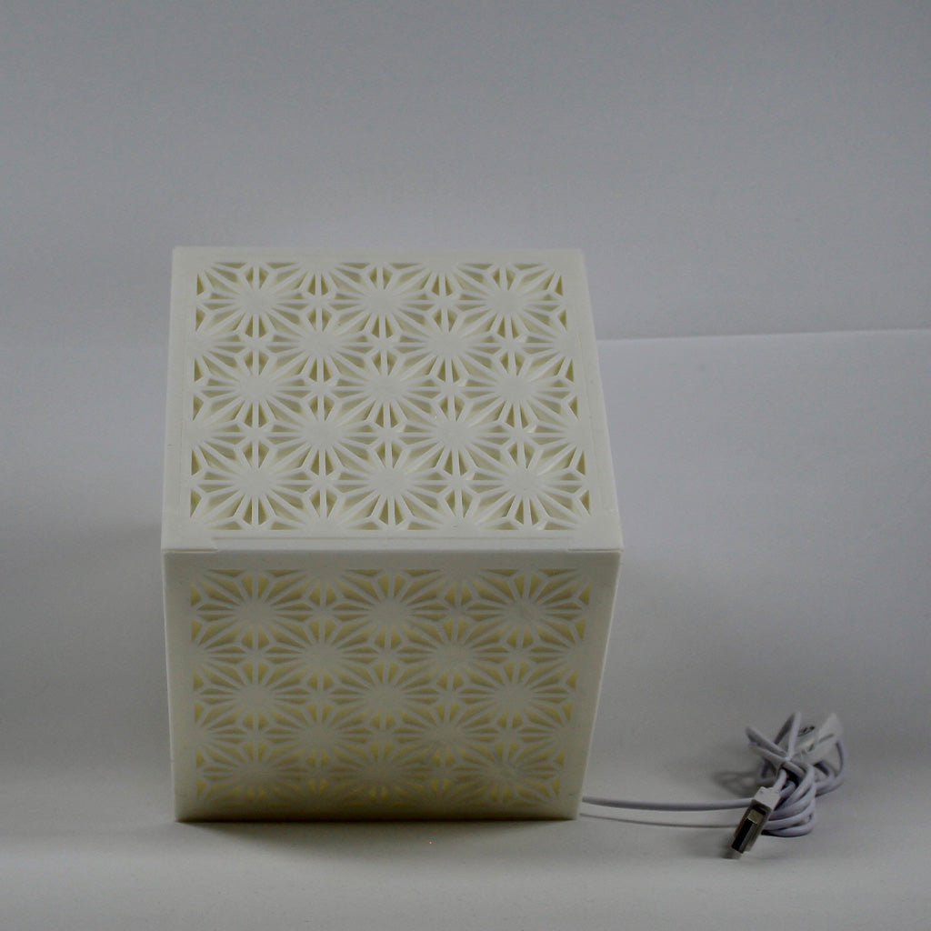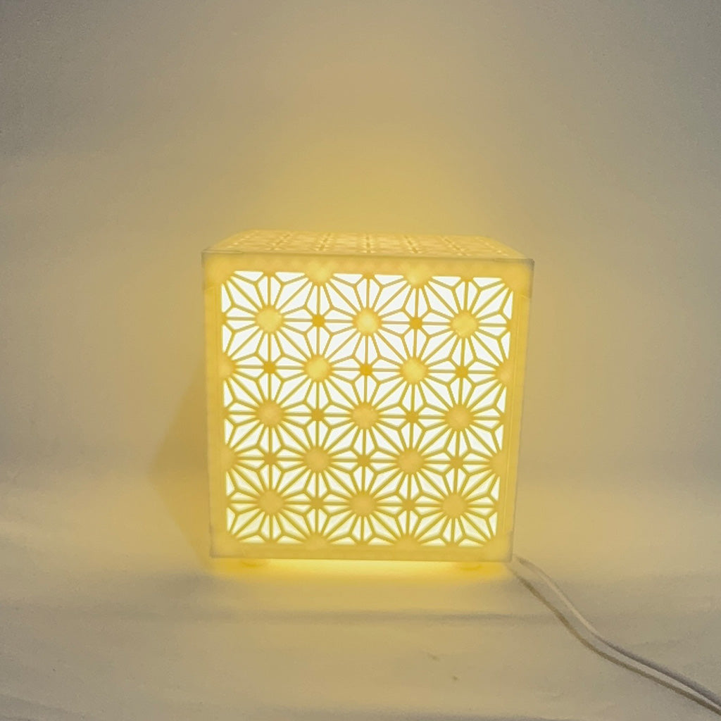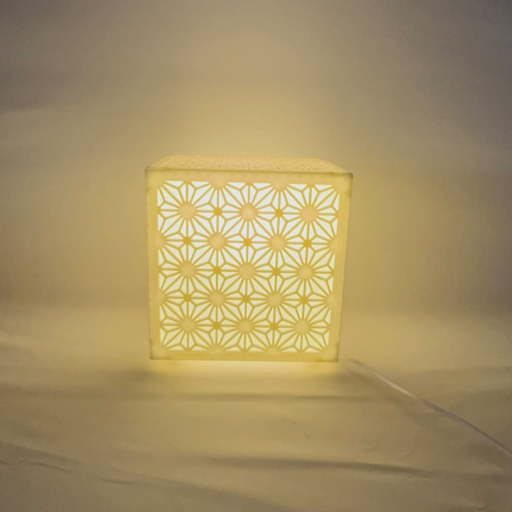 Inspired by traditional Japanese Kumiko woodworking patterns, this cube-shaped lamp features intricate floral lattice designs that cast a soft, ambient glow when lit. Perfect for Zen interiors, reading nooks, or modern Asian-inspired décor.