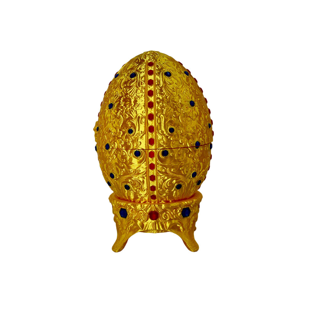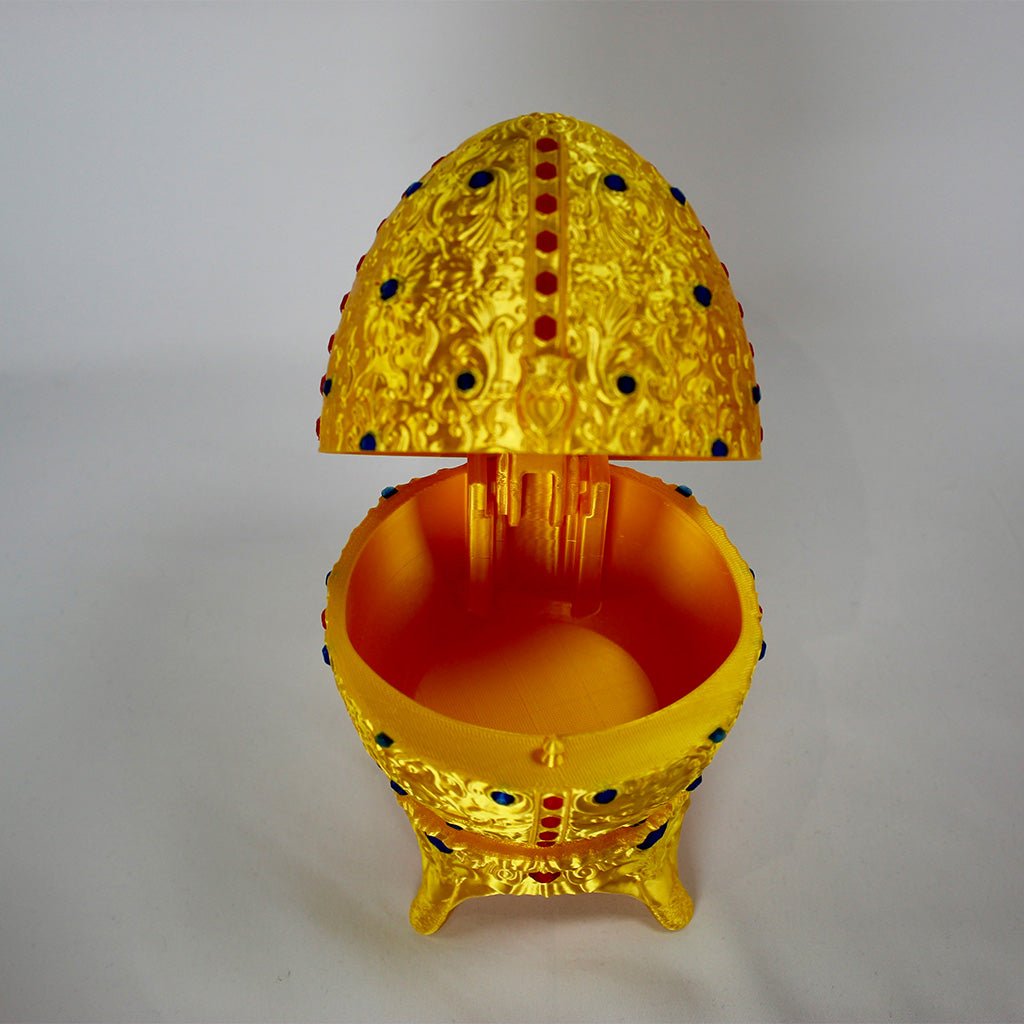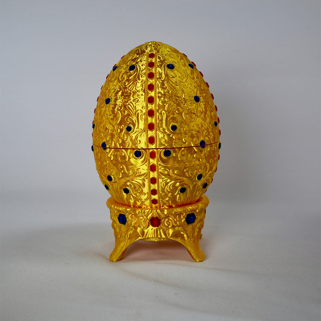 This stunning Fabergé-inspired Egg is a decorative gem! Created with high-quality 3D printing and exquisite embossed detailing, this golden container is perfect as a jewelry holder, desk accent, or luxurious collectible gift.