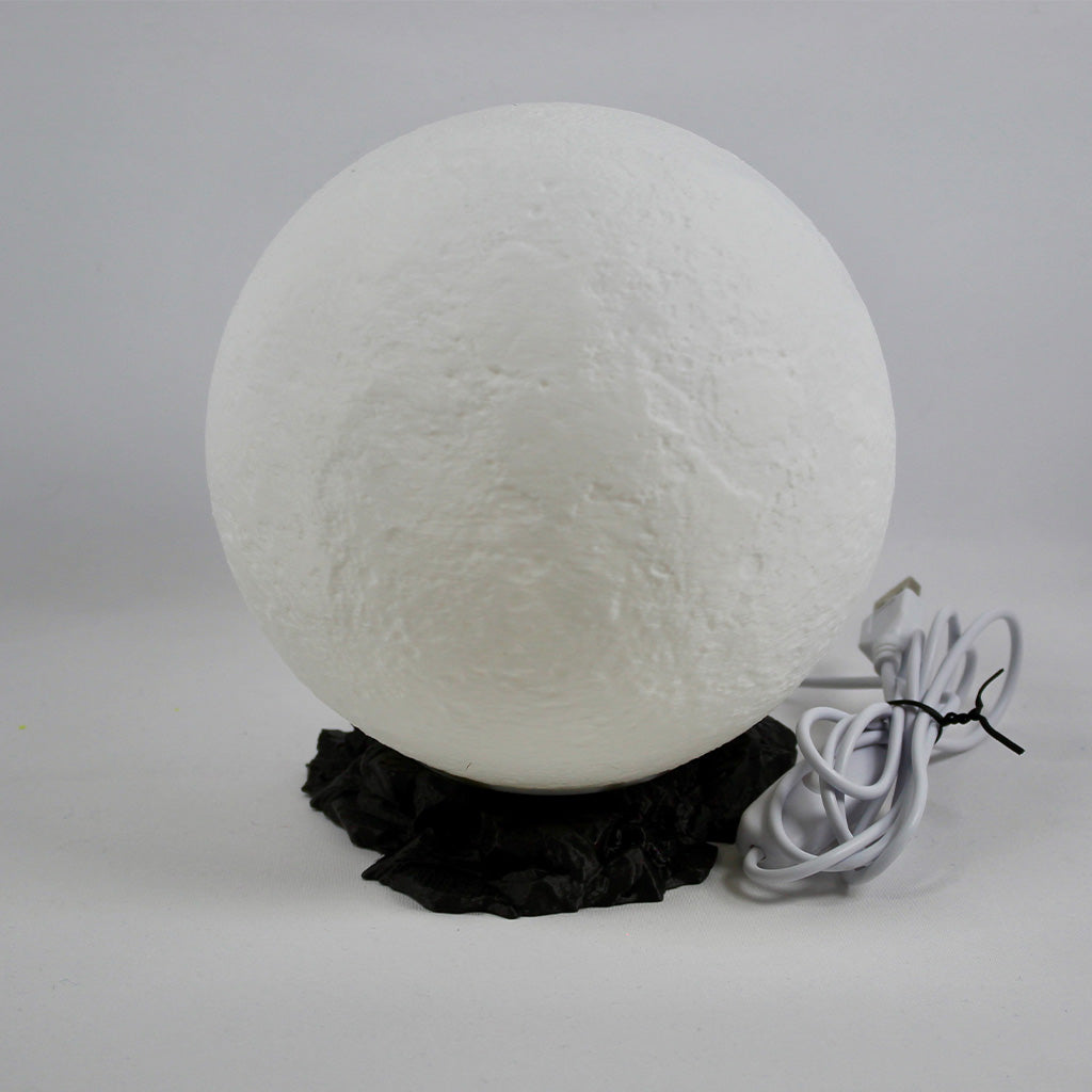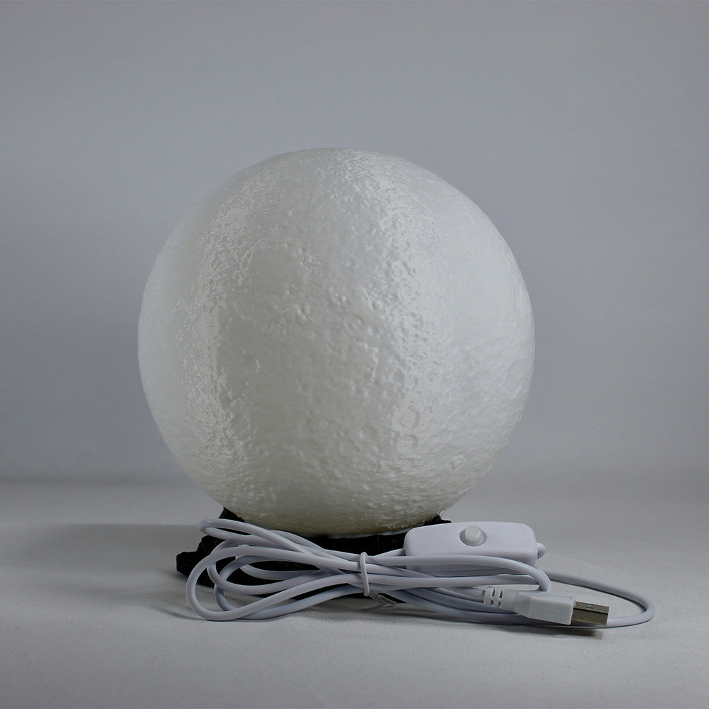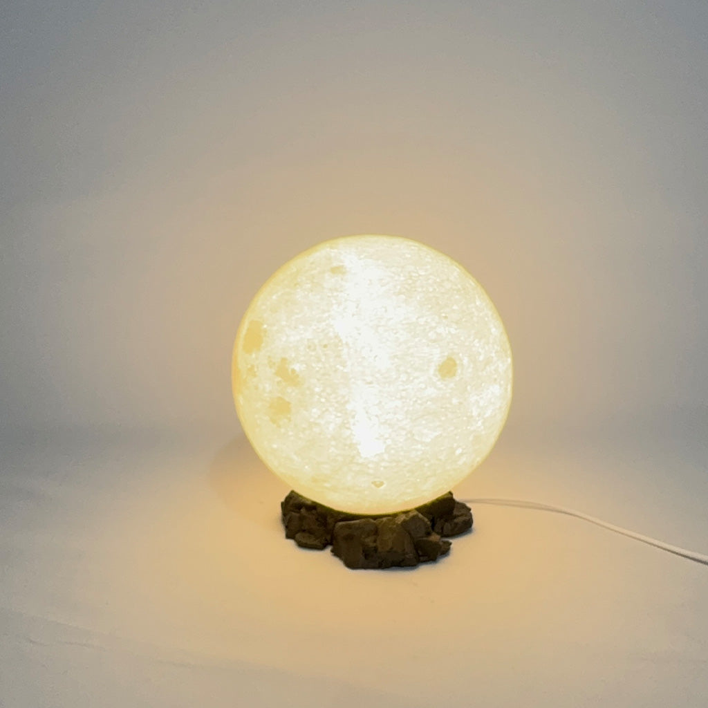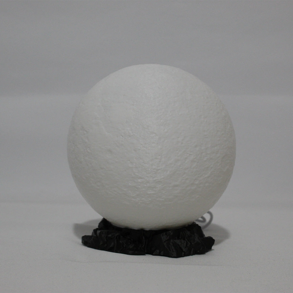 Hold the moon in your hands! The Moon Lamp is a 3D printed replica of the lunar surface with an inner glow that brings peace and celestial charm to any space. Its realistic texture and rock-like base make it a perfect nightlight, gift or piece of cosmic decor.